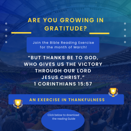 Bible Reading Exercise: Growing in Gratitude March 1 – 30, 2024 For the month of March, we are encouraging one another to grow in gratitude by reading and meditating on passages about thankfulness. Reading Guide- Click here