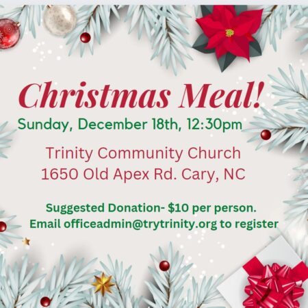 December Fellowship Meal December 18, 2022 12:30 pm Sanctuary 1650 Old Apex Rd. Cary, NC 27513 Get Directions Join us for fellowship and food on December 18th. This will be a catered meal following the worship service.