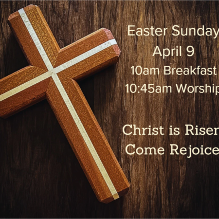 Easter Sunday Service April 9, 2023 10:00 am (10:00 am Light Breakfast; 10:45 am Worship Service) Christ is Risen! Come Rejoice.
