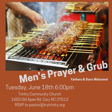 Men’s Prayer & Grub June 18, 2024 6:00 pm – 9:00 pm Sanctuary 1650 Old Apex Rd. Cary, NC 27513 Get Directions
